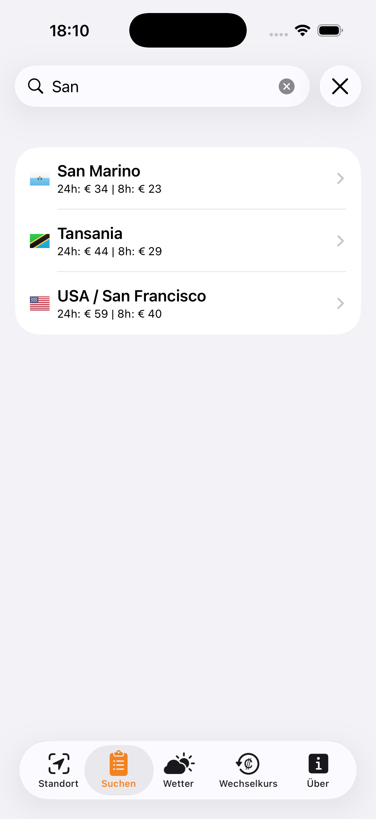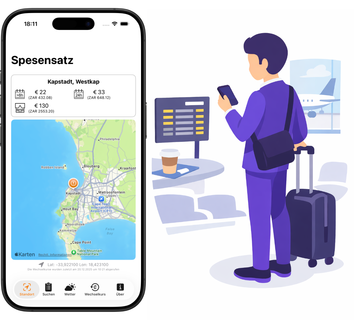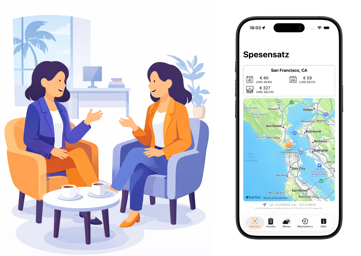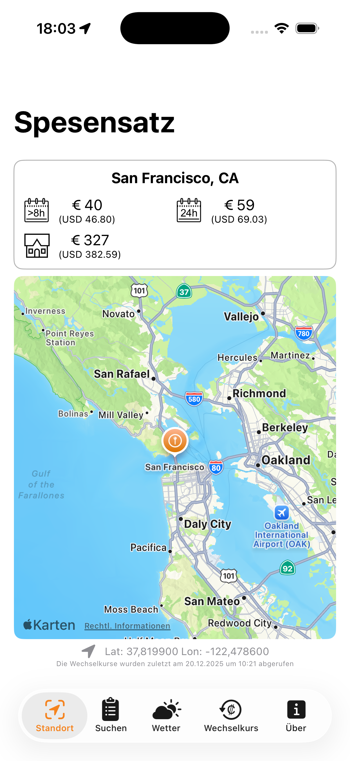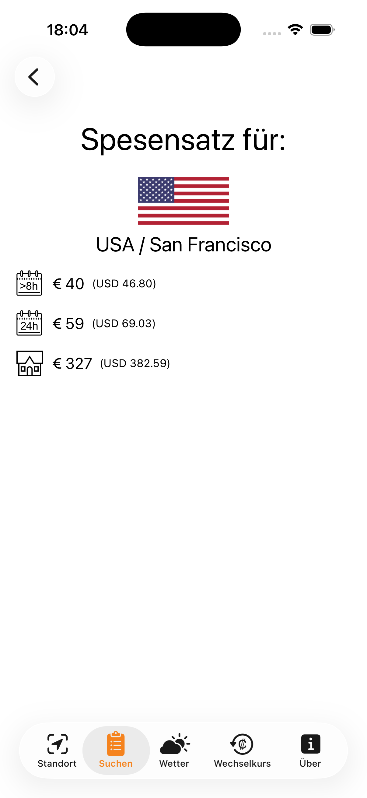 Mit Spesensatz hast Du die Antwort sofort zur Hand – klar, übersichtlich und ohne unnötige Umwege. Zusätzlich wird der Betrag direkt in die lokale Währung umgerechnet.