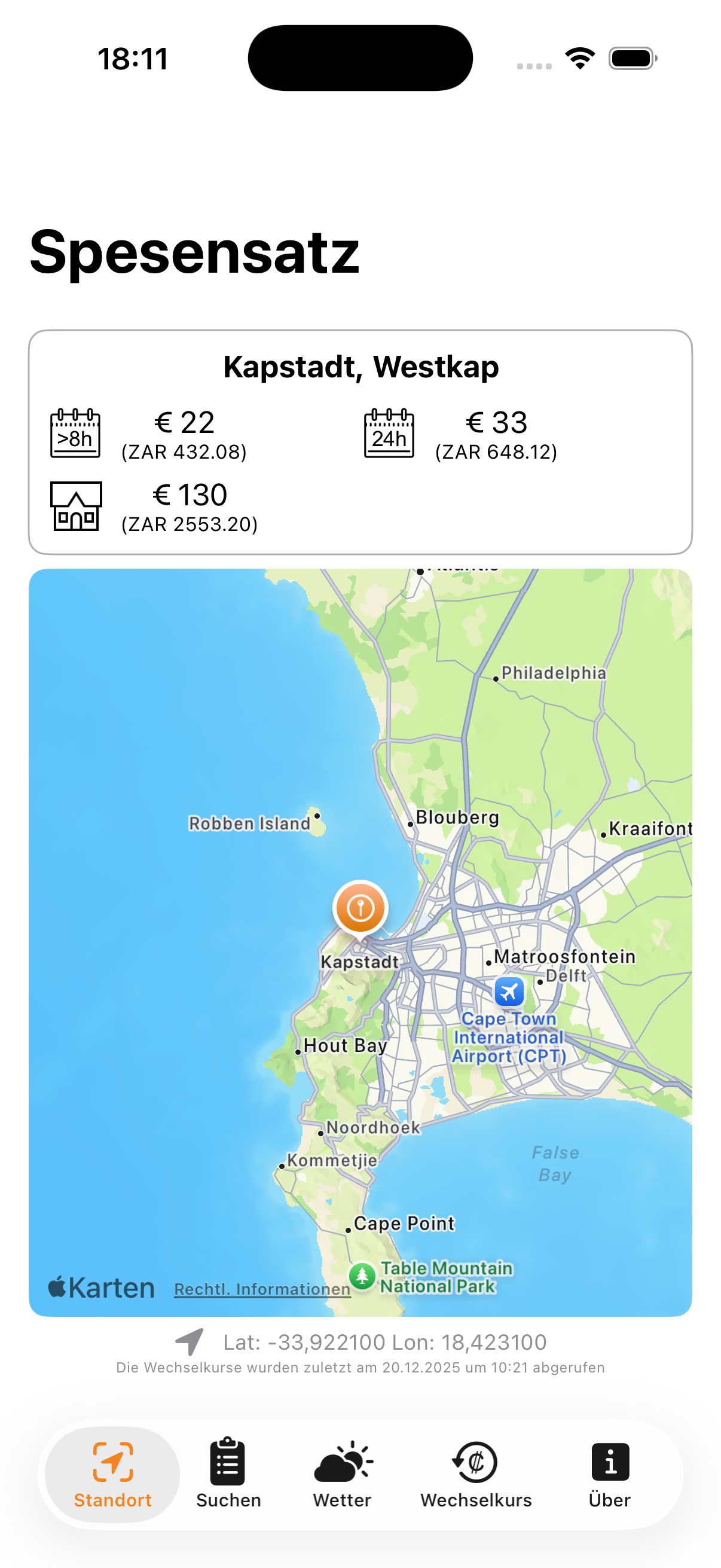 - Anzeige des Verpflegungsmehraufwand anhand des aktuellen Ortes